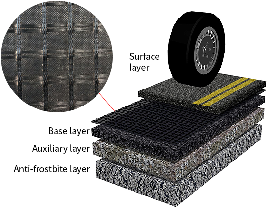 Geosynthetic fiber attached to the lower surface of the asphalt surface disperses the load and suppresses the crack propagation due to the low thermal strain and high tensile strength of the glass fiber.