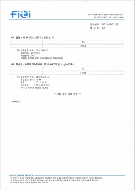 | moisture permeability | g/m2/24h | 1,693 | ASTM E96/E96M:2016,WATER | ||