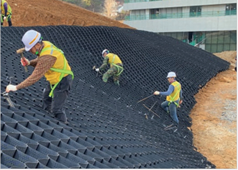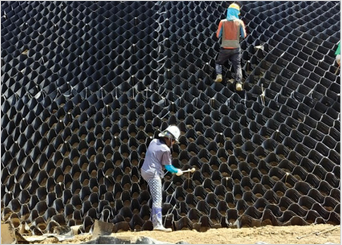 Geocell's high drainage capacity, friction and cell-soil-plant interactions prevent sliding slopes