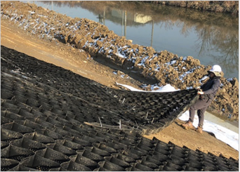 It is a method to cover slopes by laying plant material, stone filling, fluid concrete or mortar in the cell of honeycomb fiber material for civil engineering.