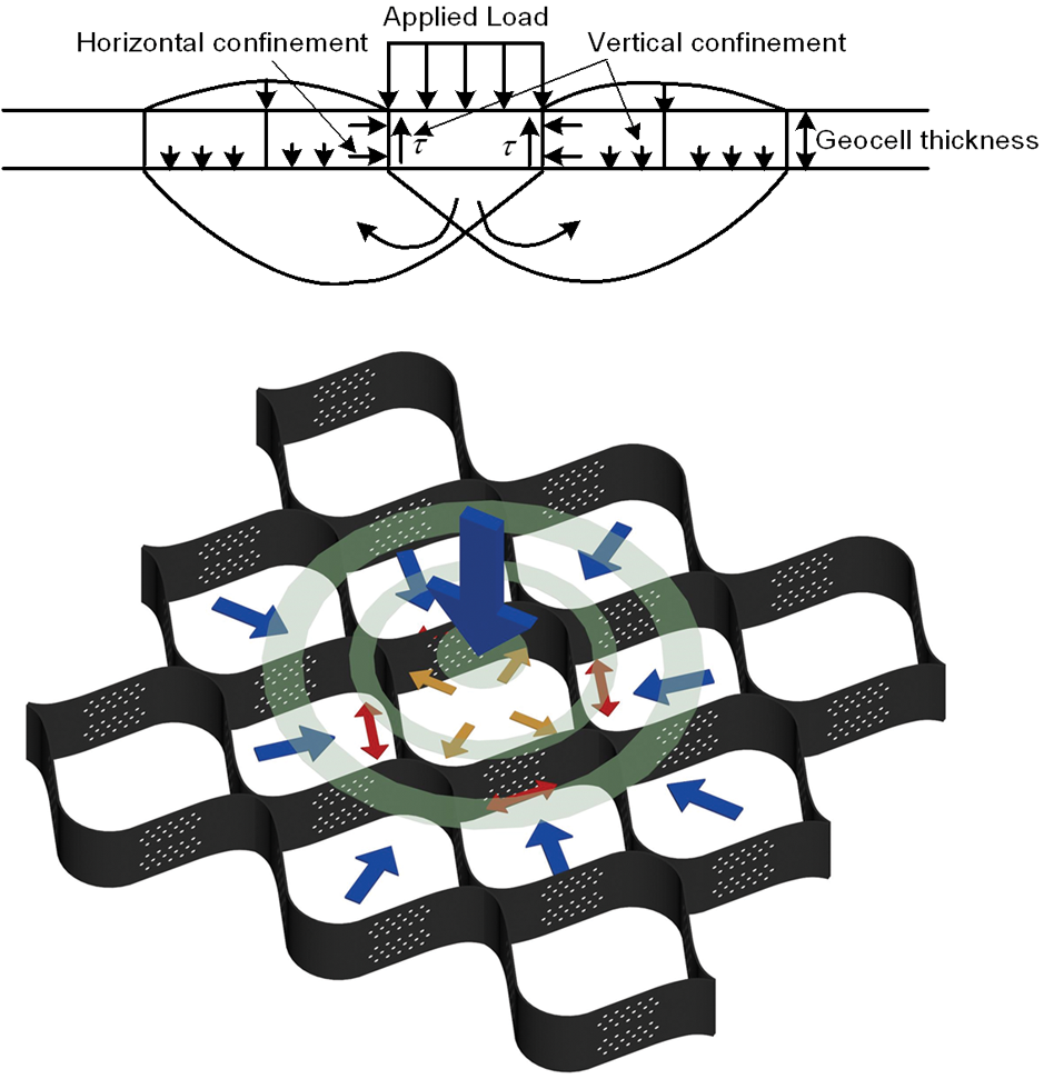 Geocell soft ground reinforcement is consisted of soil (filling material) against external force, frictional resistance, passive resistance of neighboring cells and circular stress of cells.