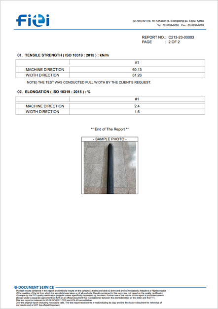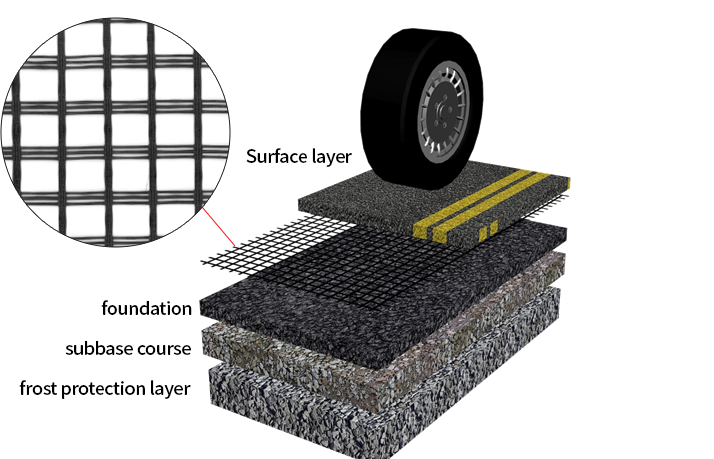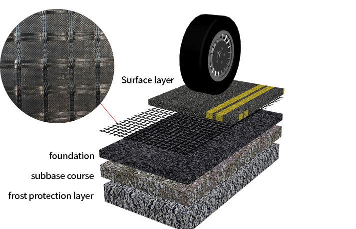- The combined reinforcement material serves as the structural framework for strengthening the asphalt layer and prevents cracking in the foundation grade by increasing the tensile strength of the asphalt layer.