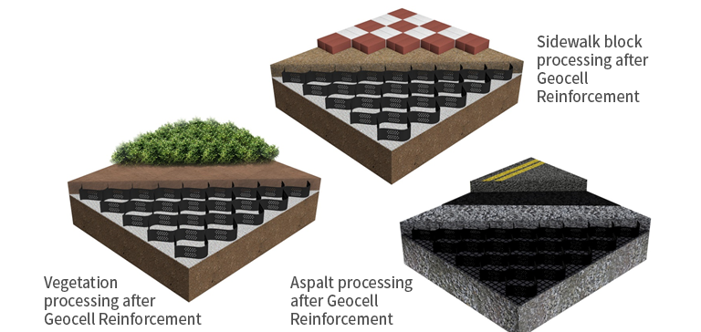 Since Geocell forms a high rigidity rigid foundation and minimizes displacement and settlement by loads, it has been applied to reinforce roads, railroads, etc.