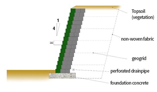 TASGW® also exhibits excellent on-site adaptability. It performs well in soil environments with weak ground conditions and seismic zones. It is outstanding with the allowable differential settlement rather than front wall structure of rigid reinforced earth retaining wall. It is constructed as a gravity structure in areas with space constraints and is made of environmentally friendly HDPE.