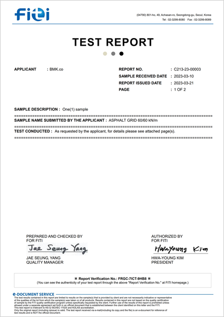 또한 도로의 단차가 있는 절단면이나 요철면에 사용되는 BMK-AE60N은 뒷면에 부직포가 부착된 형태로 구성됩니다. - 아스팔트보강용 BMK-AE60은 아스팔트의 압축력과 유리섬유의 인장강도를 결합하여 이상적인 구조체를 형성하도록 유도합니다.