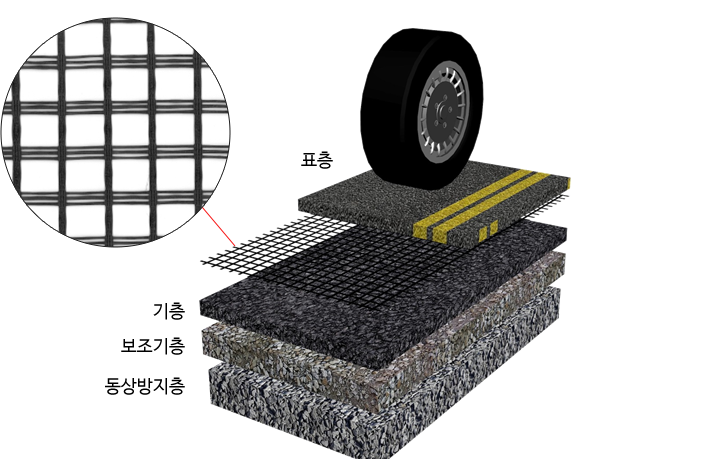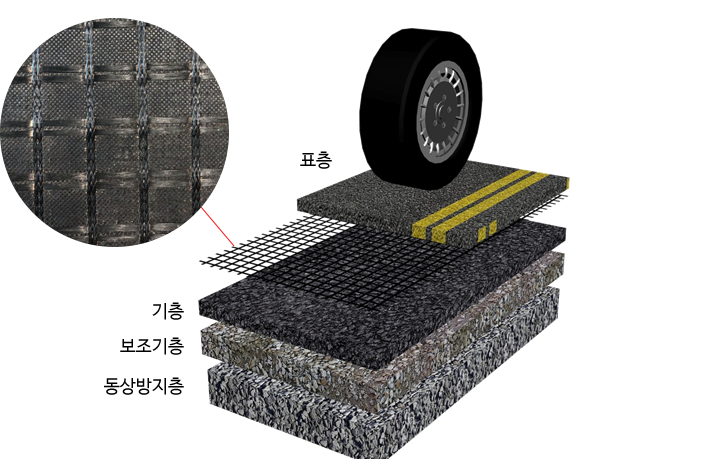 아스팔트 덧씌우기 하부에 설치한 고탄성 탄소 및 유리섬유 직조보강재가 아스팔트 포장의 부족한 인장력을 보강하여 소성변형을 억제하고, 피로 및 반사균열을 방지하는 역할을 한다.